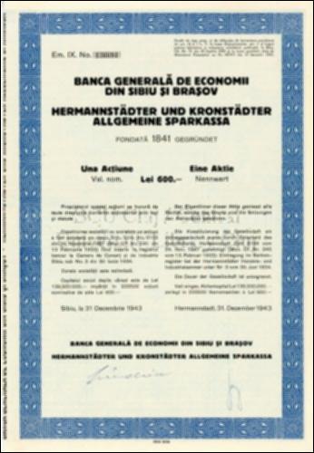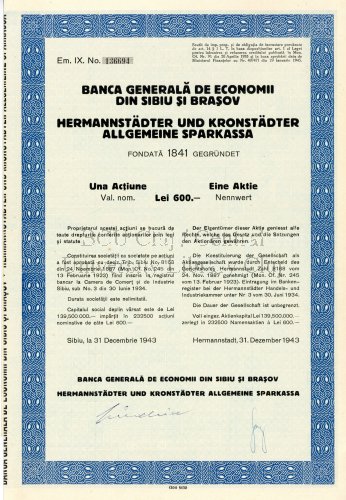 Other Titles: Hermannstädter und Kronstädter Allgemeine Sparkassa : eine Aktie nennwert lei 600, no. 136694 : Ernst Scheeser