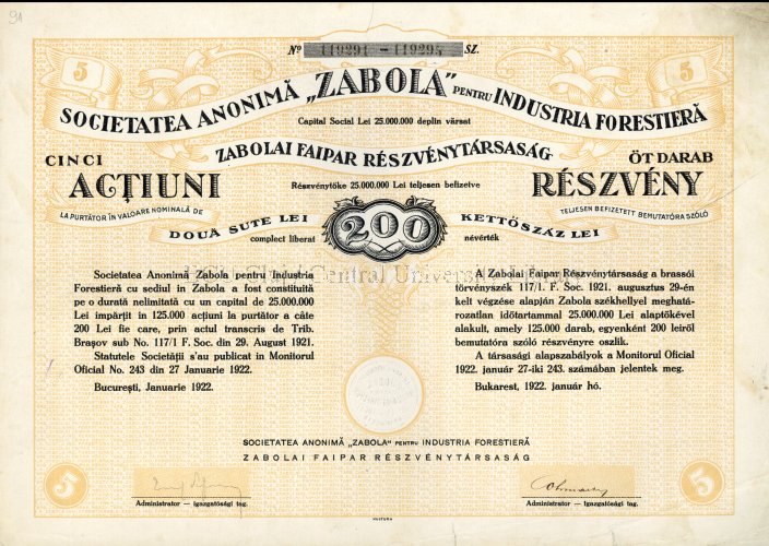 Other Titles: Zabolai Faipar Részvénytársaság : öt darab részvény teljesen befizetett bemutatóra szóló kettőszáz lei névérték, sz. 119291-119295
