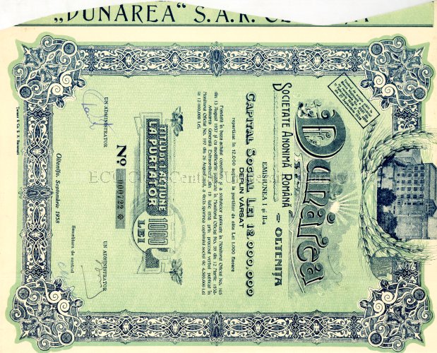 | Title: | Dunărea, Societate anonimă română, Oltenița : titlu de 1 acțiune la purtător, 1000 lei, no. 000722 |
