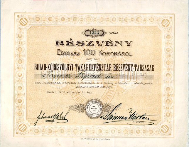 | Title: | Részvény mely által a Bihar-Kőrösvölgyi Takarékpénztár Részvény-Társaság, 1223 szám : egyszáz (100) koronáról : Popper Árpád úr |