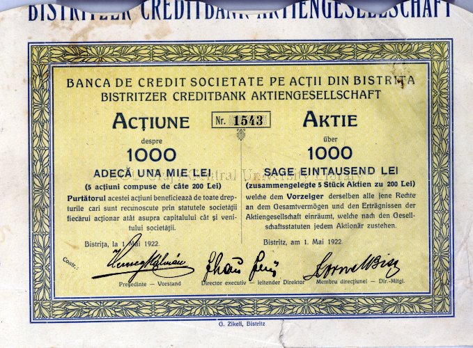 | Title: | Banca de Credit Societate pe Acții din Bistrița : acțiune despre 1000 adecă una mie lei (5 acțiuni compuse de câte 200 lei), nr. 1543 Bistritzer Creditbank Aktiengesellschaft : Aktei über 1000 sage eintausend Lei (zusammengelegte 5 Stück Aktien zu 200 Lei), nr. 1543 |