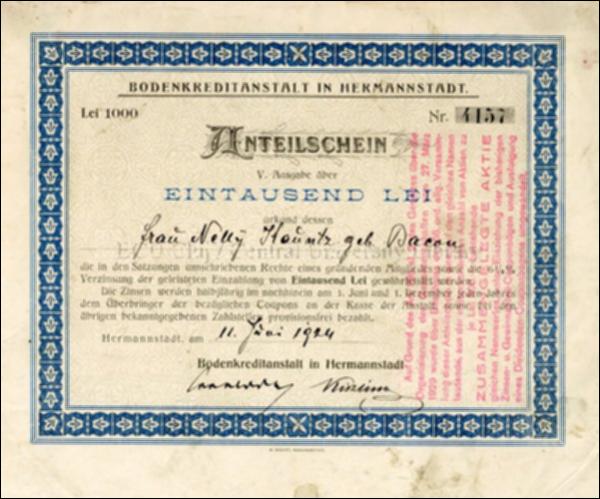 | Title: | Bodenkreditanstalt in Hermannstadt : Anteilschein Eintausend (1000) Lei, nr. 4157 : frau Nelly Kauntz geb. Bacou |