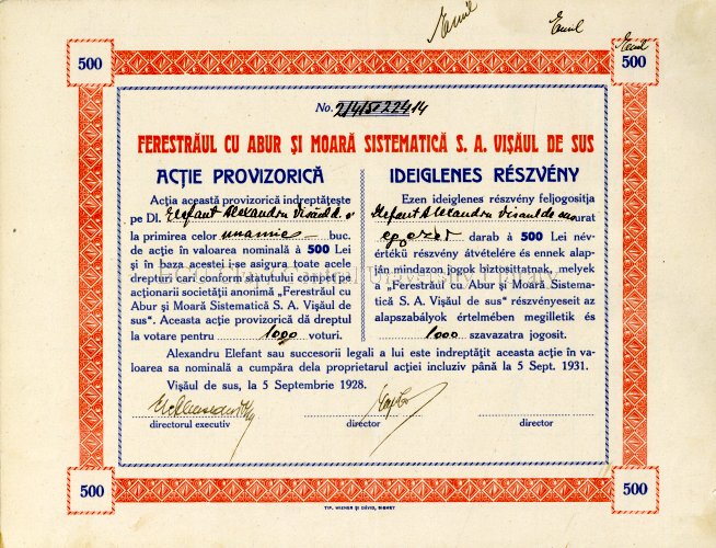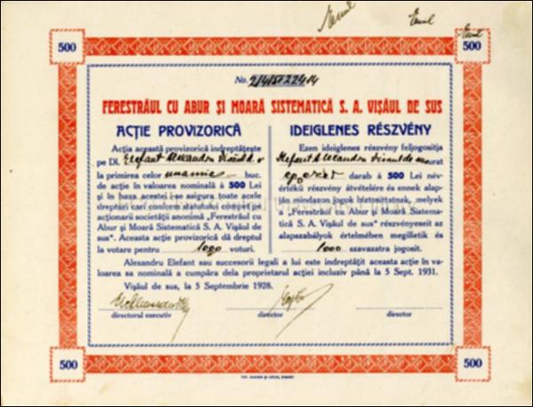 | Title: | Ferăstrăul cu Abur și Moară Sistematică S.A. Vișăul de Sus : acție provizorică, Elefant Alexandru Visăul de s., unamie buc. de acție în valoare nominală a 500 lei, no. 21415-22414 |