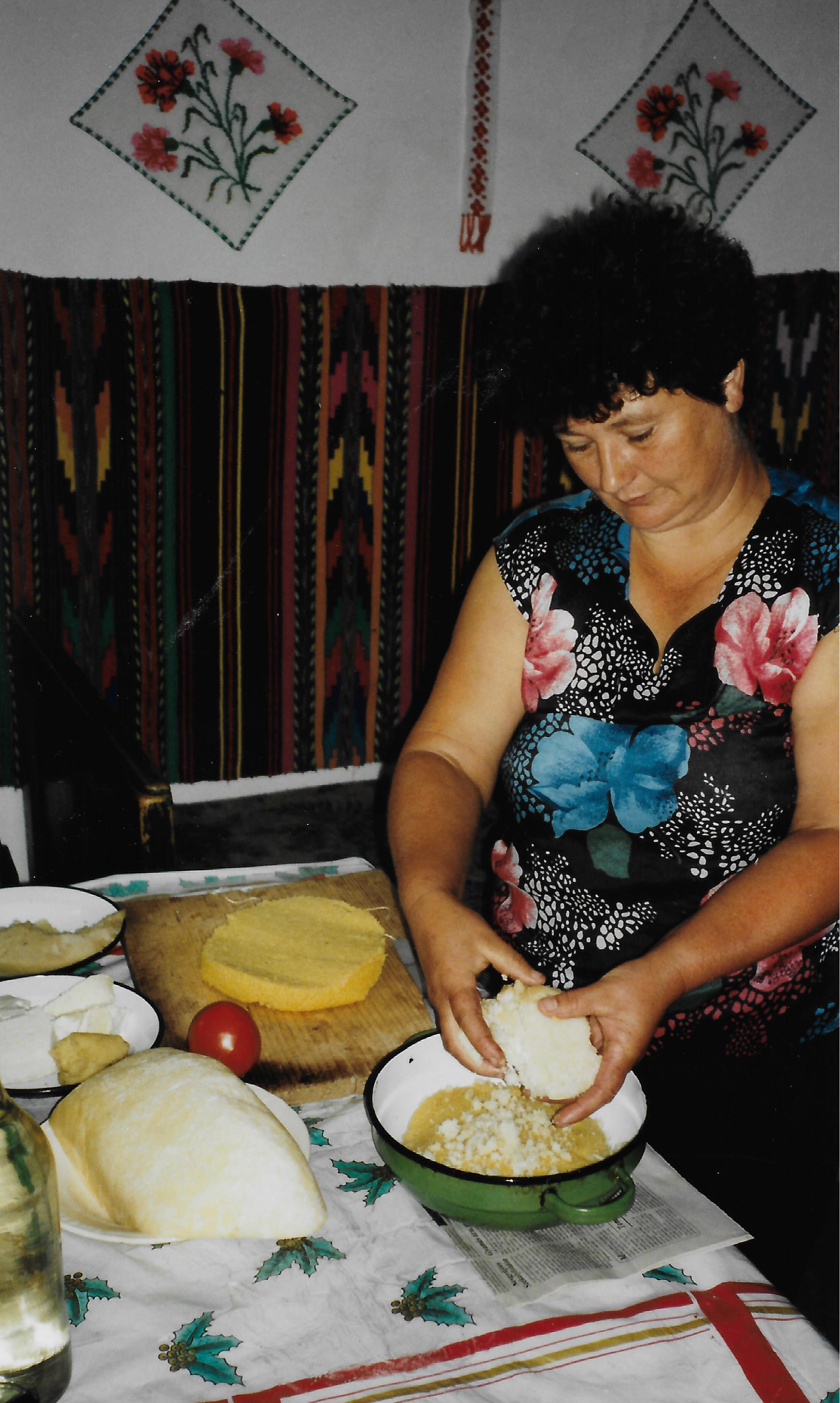 Romania 2002 making mamaliga traditional food, crumbling brinza sheep cheese