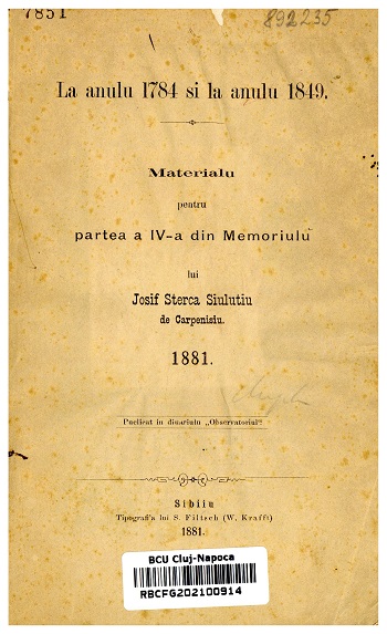 La anulu 1784 si la anulu 1849 : materialu pentru partea a IV-a din Memoriulu lui Josif Sterca Siulutiu de Carpenisiu